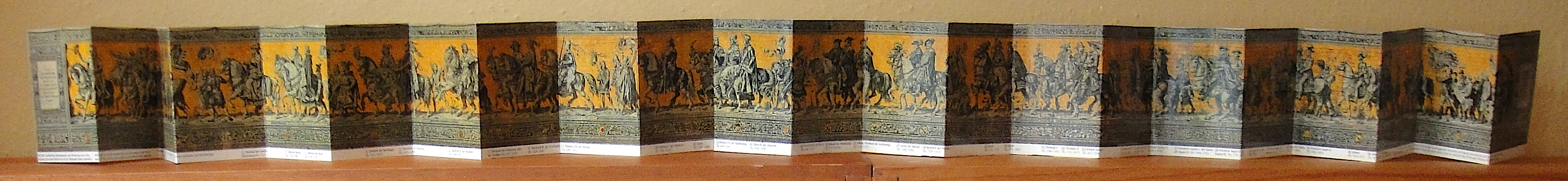 This touristic accordion guide to the mosaic comes in three languages and illustrates the full length of the mosaic. On the reverse side are details about each of the figures portrayed. The panoramic qualities of the accordion are obviously ideally suited for documenting and illustrating a work such as this one and for educating visitors to Dresden about the city's long history.