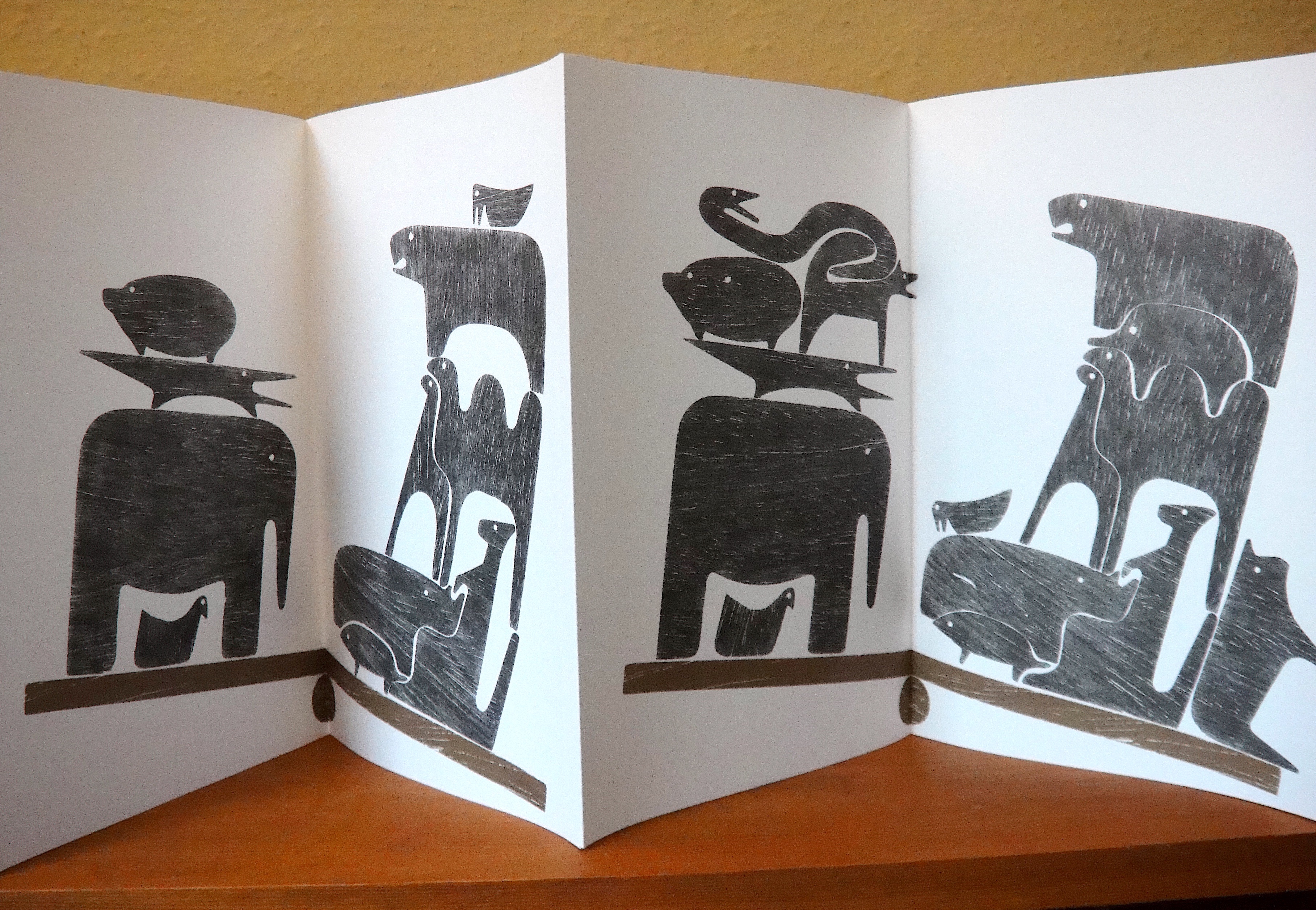 An intriguing accordion with these animal shapes with their wooden patina, balancing on each other and fitting together like pieces of a puzzle which they all finally do in the last and perfectly balanced piece!"