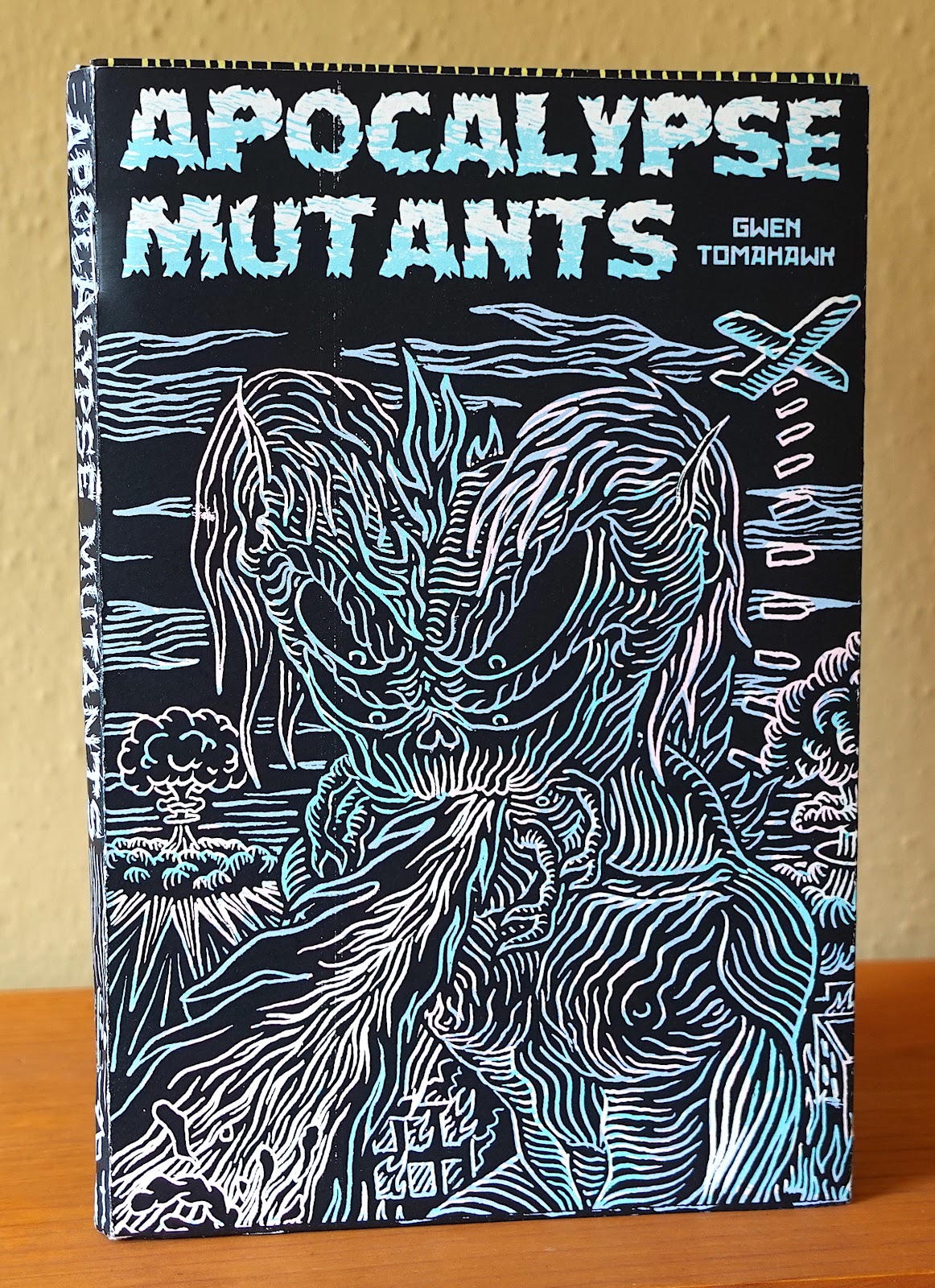 Gwen Tomahawk’s, Apocalypse Mutants (2015) opens up with a six-page wide folded cover, and then two pages with two-page extended flaps which leads into an off-center stapled gatefold spine, and finally a page with a two-page flap. When these folded elements are combined with the high-contrast aesthetics of its scratchboard imagery it almost feels as if you are holding a living thing in your hands.